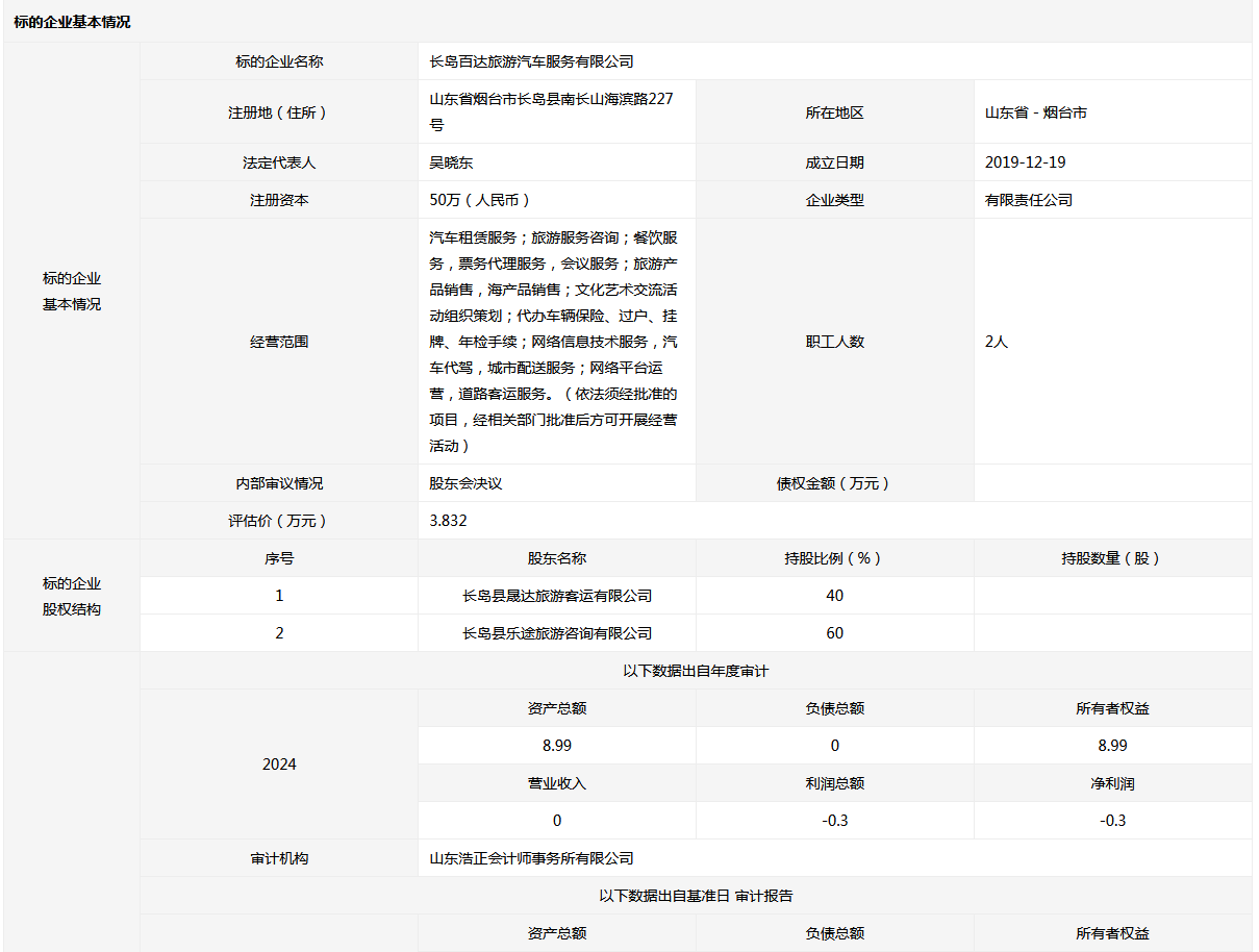 長(zhǎng)島百達(dá)旅游汽車服務(wù)有限公司40%國有股權(quán)
